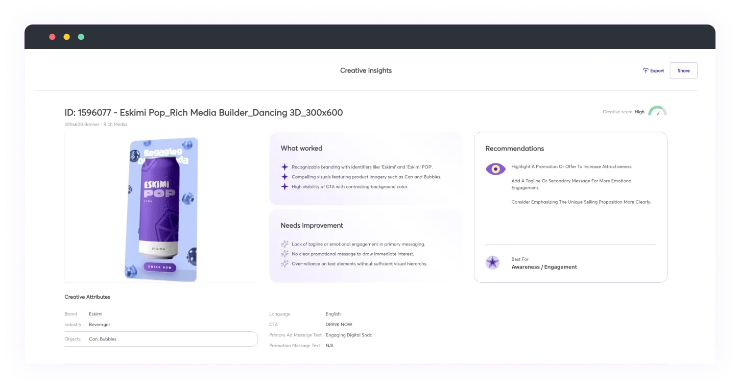 Recommendations: AI-powered, data-driven insights provide actionable recommendations that you can implement to enhance the creative's effectiveness.