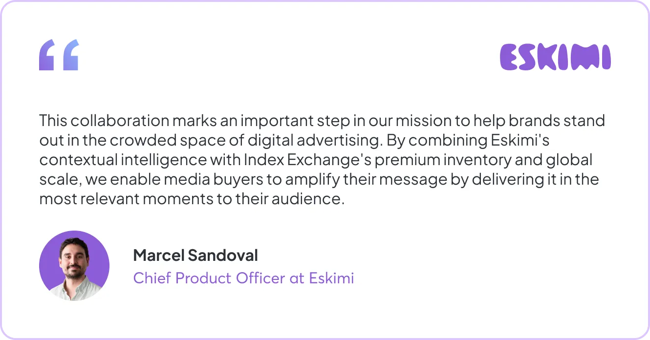 "Contextual activation through curation is the future of programmatic addressability. Our partnership with Index Exchange makes it possible to deliver contextually relevant advertising at scale, while maintaining transparency, precision, and reach," said Marcel Sandoval, Chief Product Officer at Eskimi.