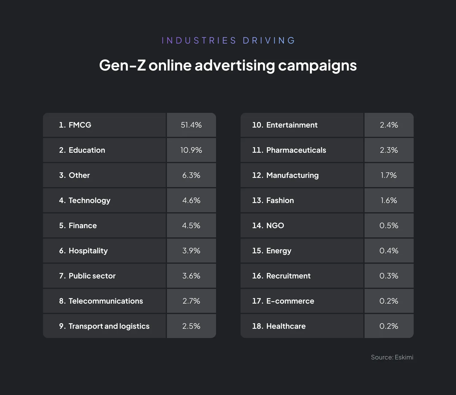 Our research shows that some industries already recognize this. FMCG in particular already invests heavily in Gen Z targeting because they know this group is shaping spending patterns right now.