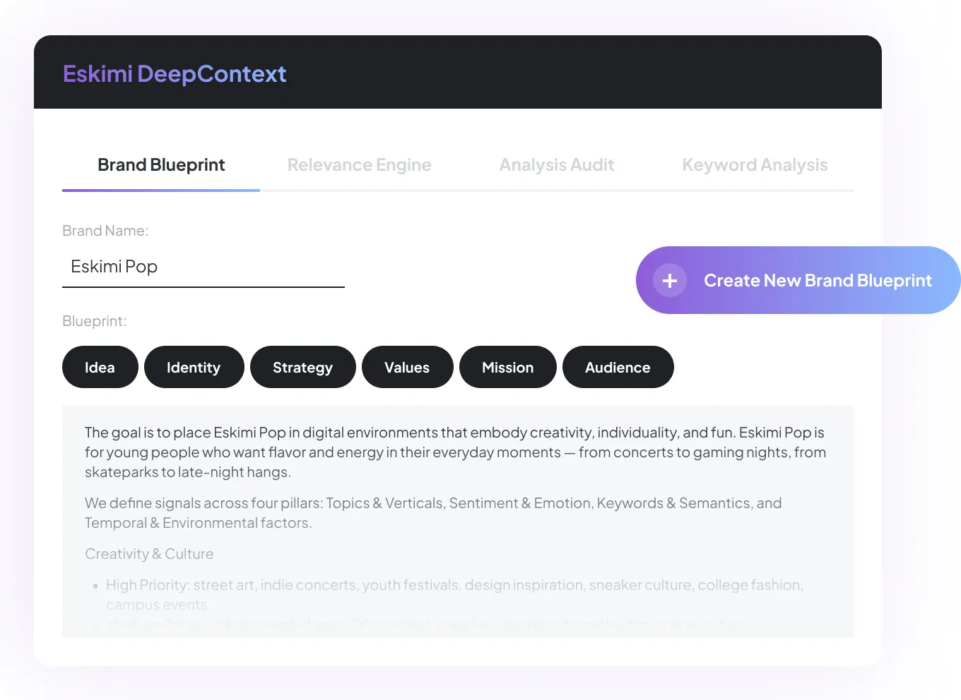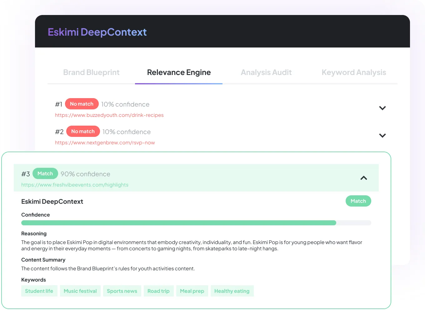 Once your Brand Blueprint is in place, DeepContext's Relevance Engine continuously scans live content across the web. It processes each page using natural language understanding to detect tone, meaning, and user intent and only selects inventory that aligns with your Brand Blueprint.